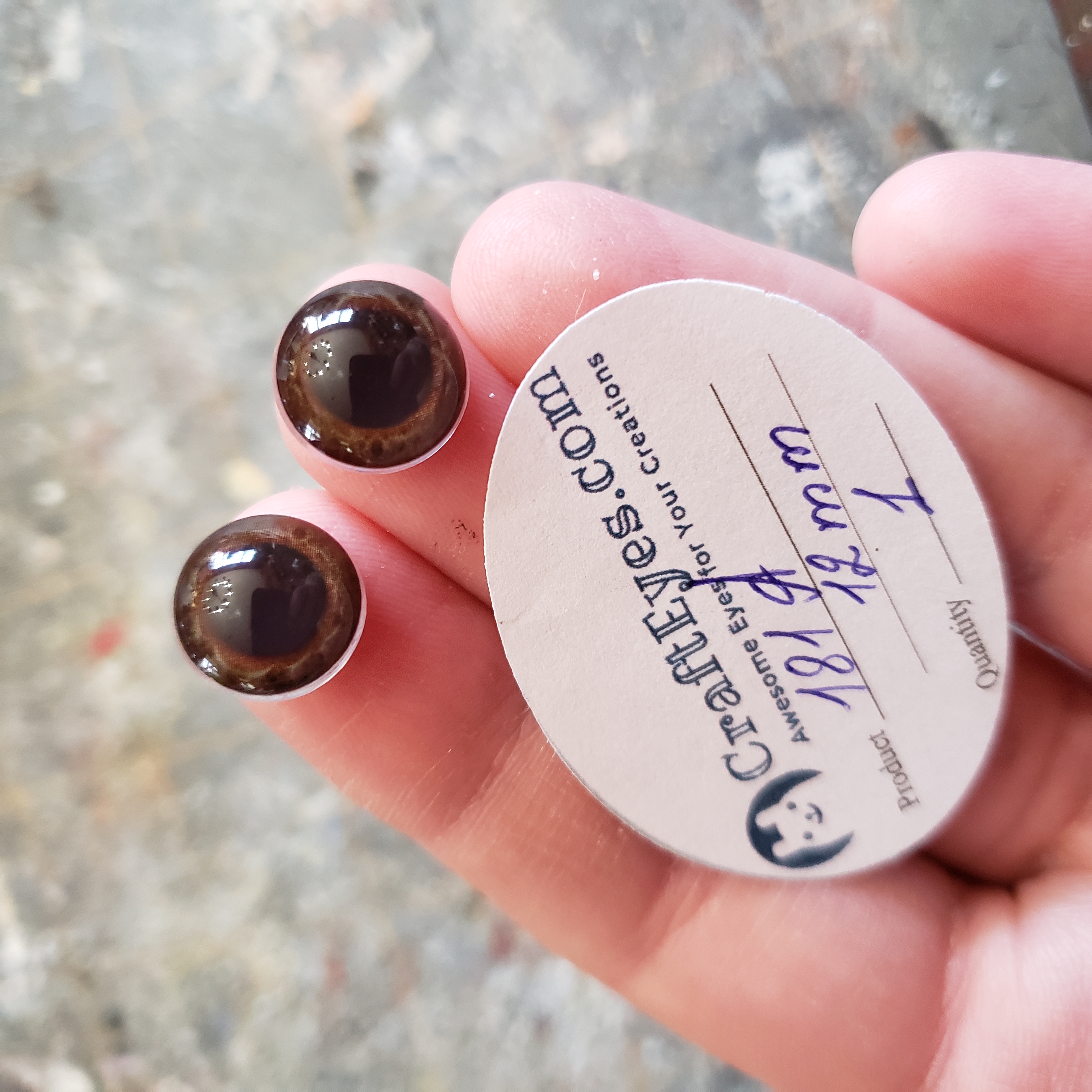 Our A series is perfect for amigurumi and soft toys (such as teddy bears). The eyes come in sizes from 4 mm all the way to 100 mm. They feature a large variety of iris colors and patterns (from simple to more realistic) and a round black pupil. The back side of the eye can be made either with a ribbed plastic stem (for use with plastic washers) or with a wire loop for sewing them on. You can easily snap them off if you don't need them.